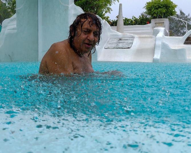In picture: Ranjeet shared this picture with a quirky caption, which read: Ayeee... "Pani Bachao Mission" ko dhyan may rakhte huye BMC k Pani may nahi Barish k Pani may naha raha hu.